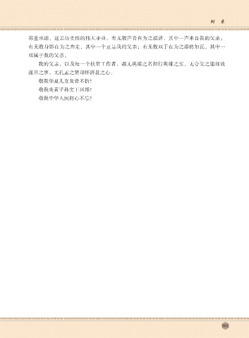 附 录 郑重承诺,这是历史性的伟大事业。有无数声音在为之说话,其中一声来自我的父亲; 有无数身影在为之奔走,其中一个正是我的父亲;有无数双手在为之添砖加瓦,其中一 双属于我的父亲。 我的父亲,以及每一个扶贫工作者,都无英雄之名却行英雄之实,无夸父之能却效 逐日之事,无孔孟之贤却怀济世之心。 敬我华夏儿女龙骨不折! 敬我炎黄子孙实干兴邦! 敬我中华人民初心不忘! 903