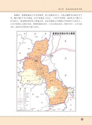第二章 贫困状况与扶贫方略 富源县 富源县地处云贵交界地带,是云南的东大门,全县总面积为3348平方千 米,辖9个镇1个乡2个街道、161个村委会(社区)、1723个自然村,2020年末户籍人口 83.38万人,是国家扶贫开发工作重点县。全县有建档立卡贫困人口25584户111816人, 占全市贫困人口的13.52%;贫困行政村130个,占全市的10.81%;贫困乡8个,占全市的 16%。2014年末贫困发生率11.87%。 75
