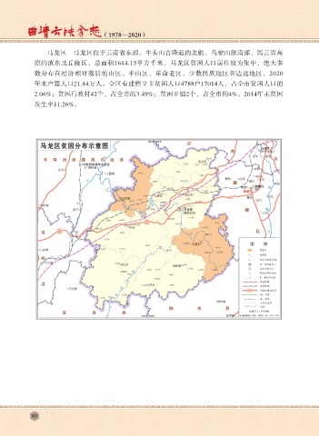 (1978—2020) 马龙区 马龙区位于云南省东部,牛头山古隆起的北侧,乌蒙山脉南部,属云贵高 原的滇东北丘陵区。总面积1614.15平方千米。马龙区贫困人口居住较为集中,绝大多 数分布在经济相对落后的山区、半山区、革命老区、少数民族地区和边远地区,2020 年末户籍人口21.44万人。全区有建档立卡贫困人口4788户17014人,占全市贫困人口的 2.06%;贫困行政村42个,占全市的3.49%;贫困乡镇2个,占全市的4%。2014年末贫困 发生率11.26%。 80
