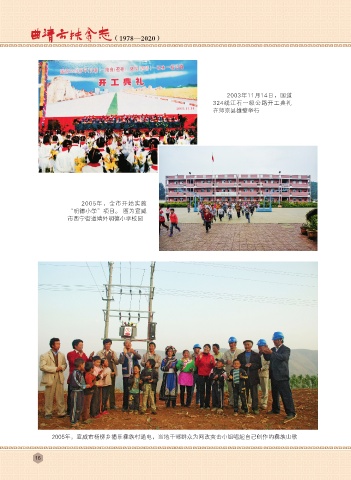 (1978—2020) 2003年11月14日,国道 324线江石一级公路开工典礼 在师宗县雄壁举行 2005年,全市开始实施 “明德小学”项目。 图为宣威 市西宁街道靖外明德小学校园 2005年,宣威市杨柳乡播乐彝族村通电,当地干部群众为网改突击小组唱起自己创作的彝族山歌 16