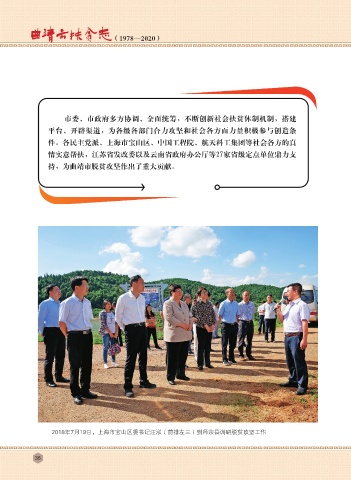 (1978—2020) 市委、市政府多方协调、全面统筹,不断创新社会扶贫体制机制,搭建 平台、开辟渠道,为各级各部门合力攻坚和社会各方面力量积极参与创造条 件。各民主党派、上海市宝山区、中国工程院、航天科工集团等社会各方的真 情实意帮扶,江苏省发改委以及云南省政府办公厅等27家省级定点单位鼎力支 持,为曲靖市脱贫攻坚作出了重大贡献。 2018年7月19日,上海市宝山区委书记汪泓(前排左三)到师宗县调研脱贫攻坚工作 36