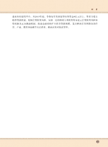 附 录 造良好的信用平台。从2015年起,争取每年发放信贷扶贫资金8亿元以上。要着力建立 精准贷款机制,化解信贷扶贫风险,安排一定的财政专项扶贫资金建立信贷扶贫风险补 偿机制及正向激励机制,鼓励金融机构扩大扶贫贷款规模,重点解决好贫困群众的住 房、产业、教育和治病等突出需求,提高扶贫对象获贷率。 817