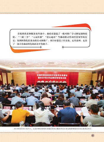 在精准扶贫和脱贫攻坚战中,曲靖市创造了一批可推广学习和复制的经 验,“三联三争”“五面红旗”“爱心超市”等曲靖模式得到省委领导的肯 定,得到国务院扶贫办的认可和推广,项目库建设干在实处、走在前列,走出 了一条具有曲靖特色的扶贫开发路子。 2019年4月20日至21日,全国完善县级项目库建设现场会暨扶贫项目资金绩效管理培训班在富源县举办 87